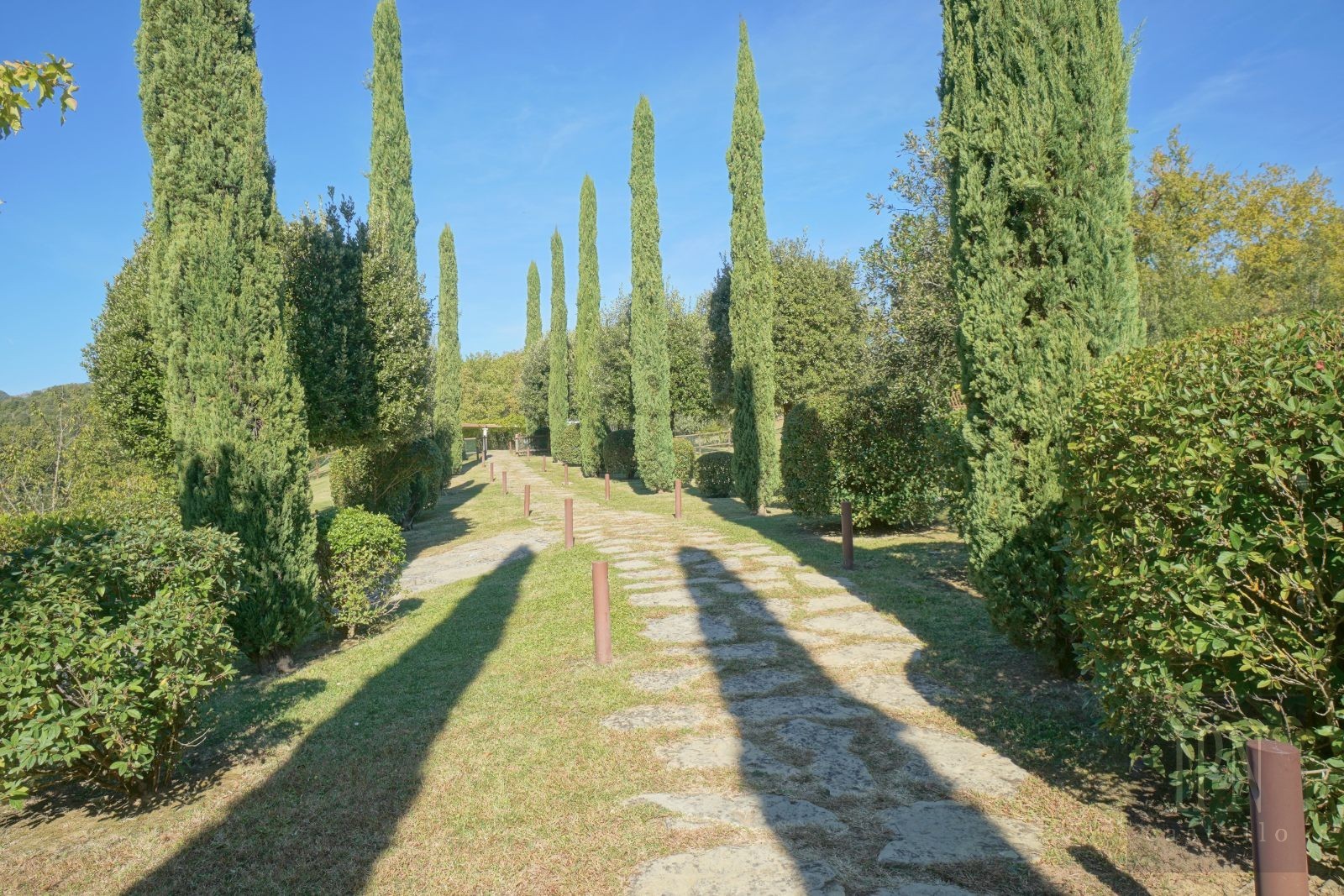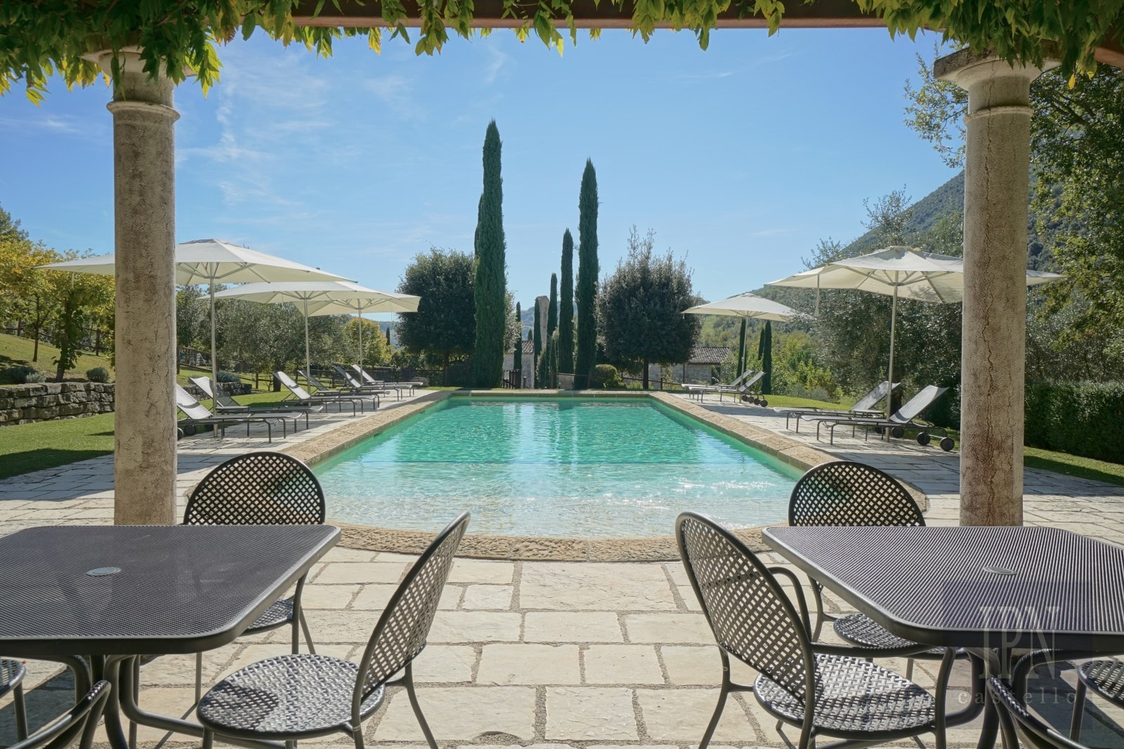 A Roman-style walkway lined with cypress and holly oak trees leads to the 15 x 5.5-metre swimming pool, surrounded by lawns and sun loungers. With a shallow children’s section, shaded pergola, outdoor shower and a pool house equipped with a fridge and restroom, the pool area offers complete comfort and seclusion.