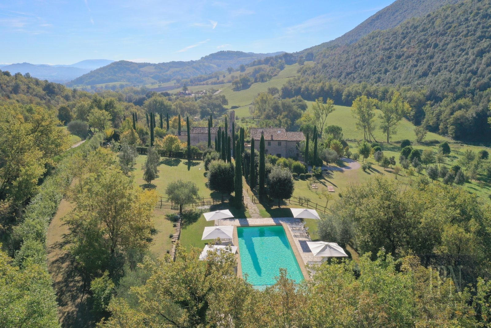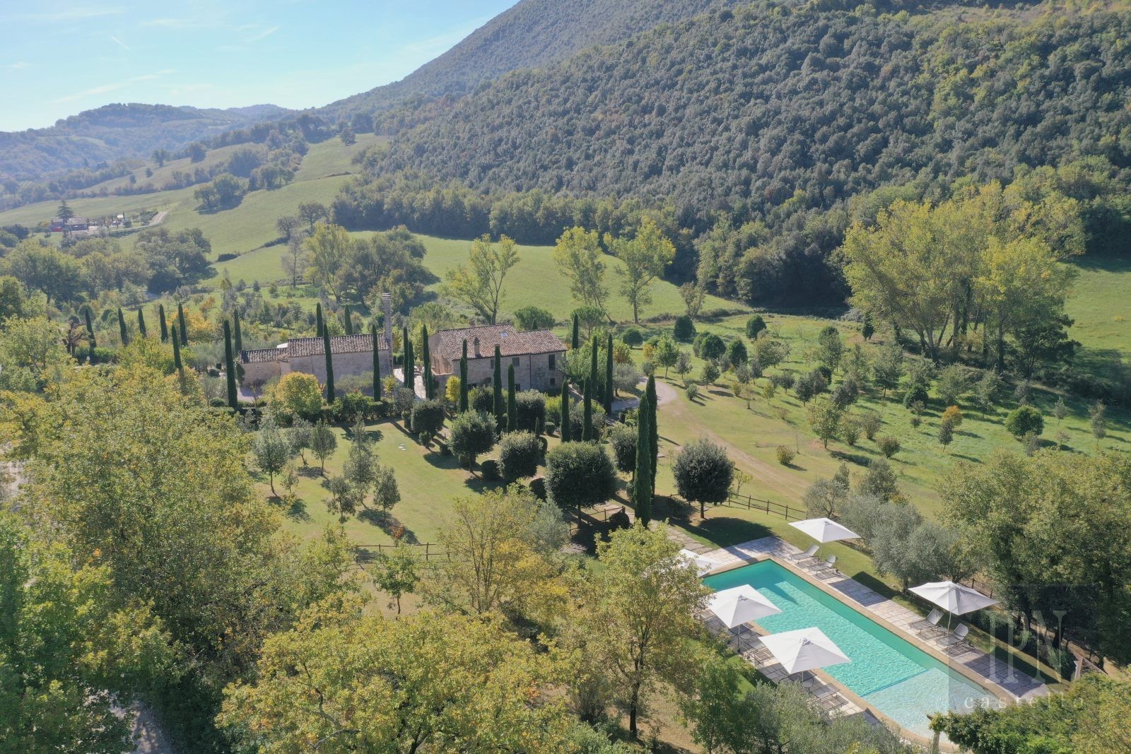 Situated at the foot of Monte Tezio, the property enjoys sublime panoramic views—from Monte Subasio and Assisi to the south, Antognolla Castle to the west, and the wooded Apennines to the north. Access is via a quiet gravel road, and Antognolla Golf Club, one of Italy’s finest courses, is just a ten-minute drive away. The villages of Pierantonio and Umbertide are close by, while Perugia lies only 25 minutes away.