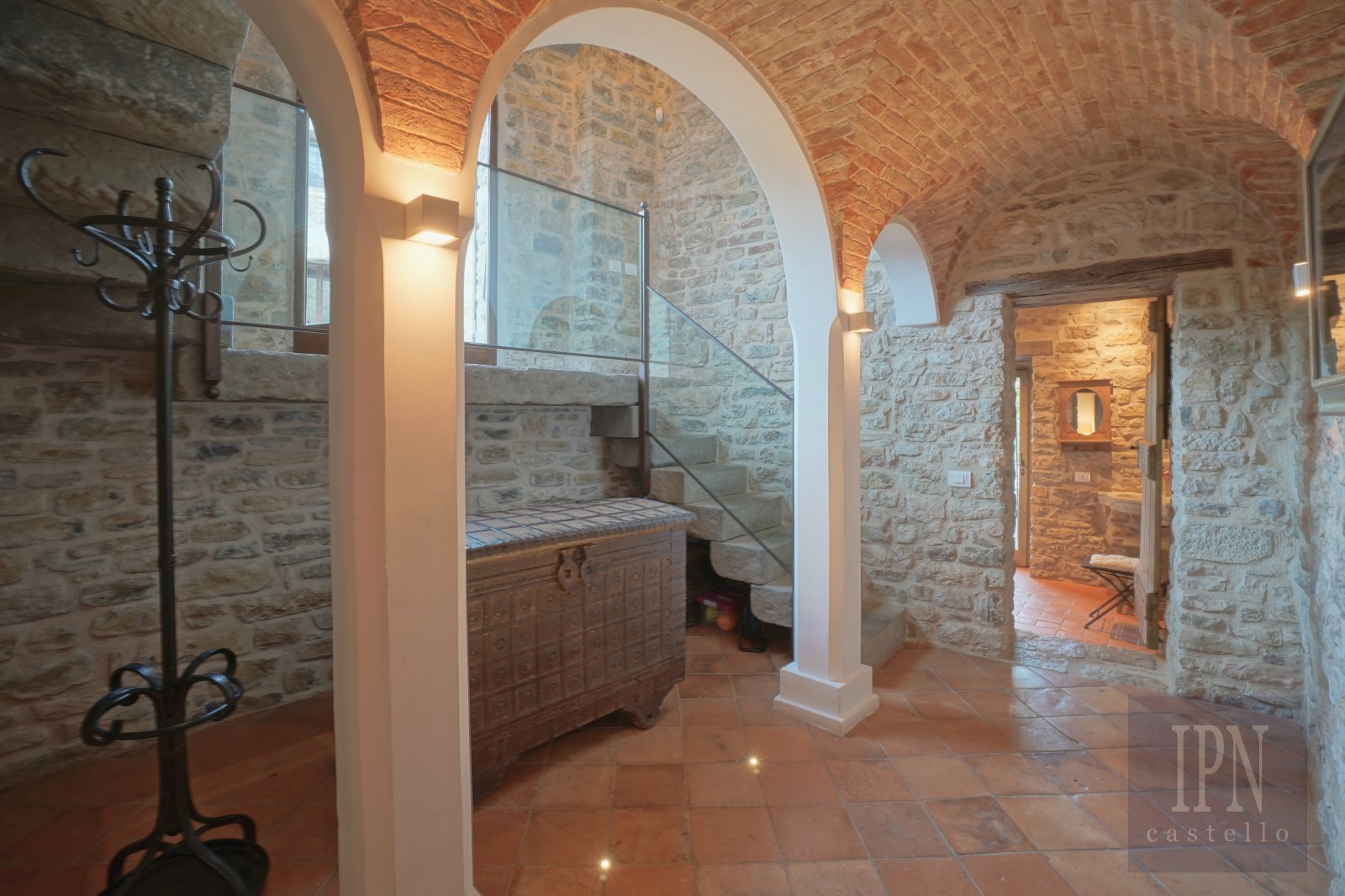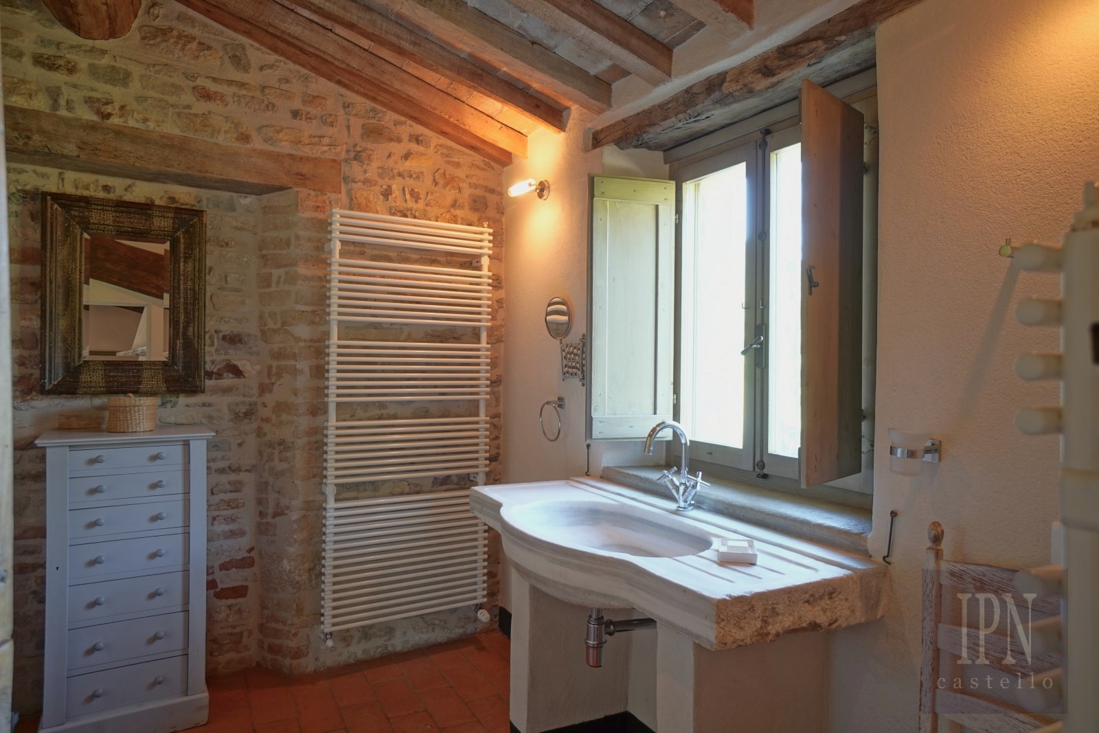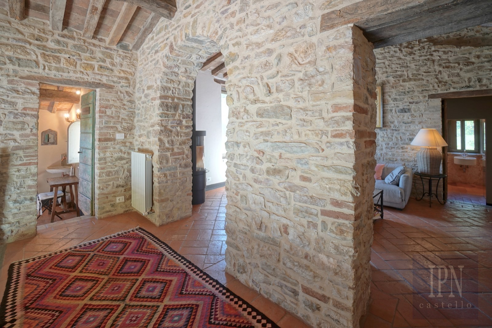 The heart of the property is the 134 square meter ancient church, now transformed into a magnificent living space that preserves its spiritual tranquility. Its original architecture has been carefully revealed, including the discovery of a small crypt, and the space now houses a large, well-equipped kitchen, a dining room, and an impressive main living area. Floor-to-ceiling windows open onto un-spoilt classical Umbrian views, while the atmosphere remains magically peaceful, perfect for reading, relaxing, yoga and especially for hosting friends and family.