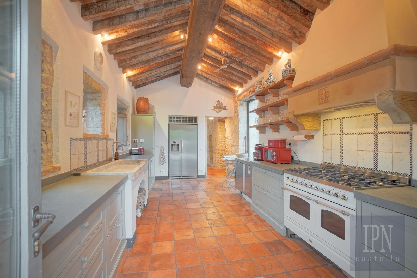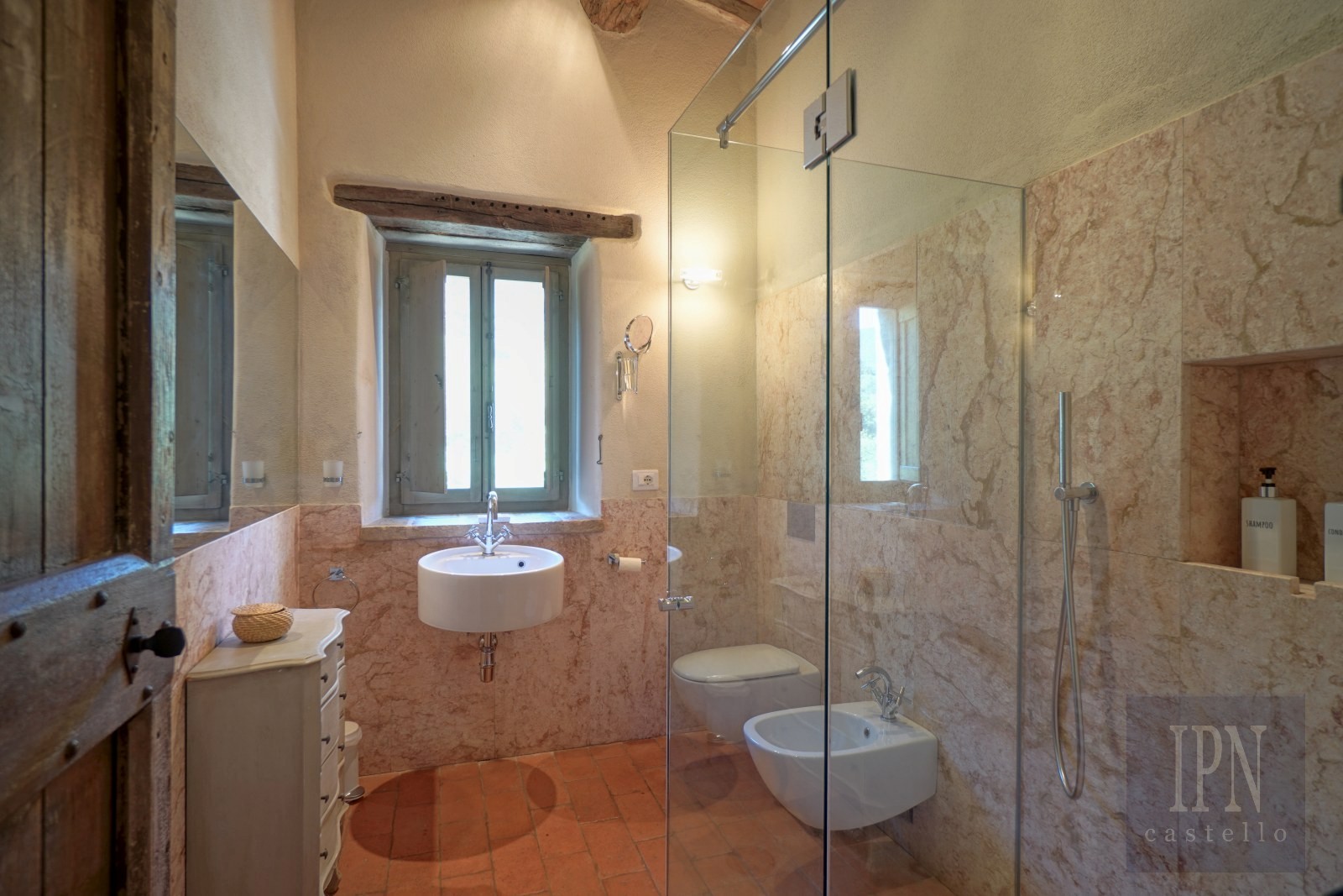 The restored farmhouse of 340 square meters accommodates up to fourteen family and friends, five bedrooms with en-suite bathrooms, two single bedrooms and one double bedroom sharing a bathroom. Each room combines rustic character with elegant design stone walls, reclaimed terracotta floors and beamed ceilings giving a warm peaceful atmosphere. Several bedrooms enjoy private terraces with panoramic views. One of the ground floor suites is designed for disabled access another with a free-standing bath and the principal bedroom with a fireplace and private terrace. All six double bedrooms and the kitchen are air-conditioned. The entrance to the farmhouse boasts a feature stone flying staircase to the lower and upper floor with arches and a brick vaulted ceiling.