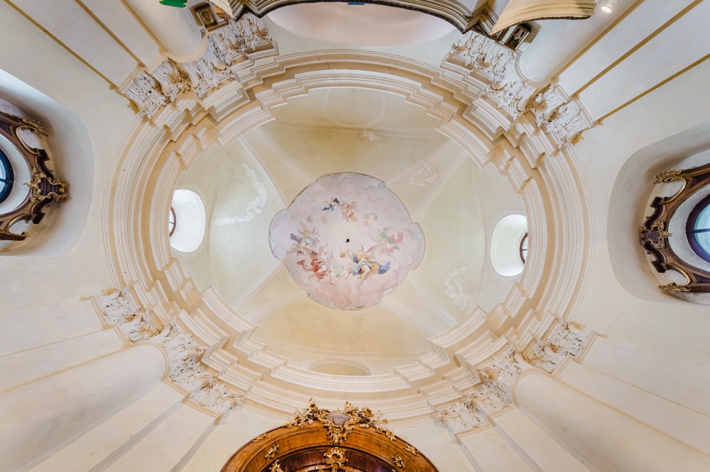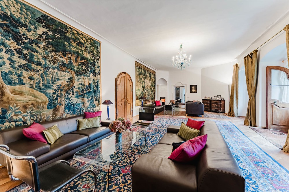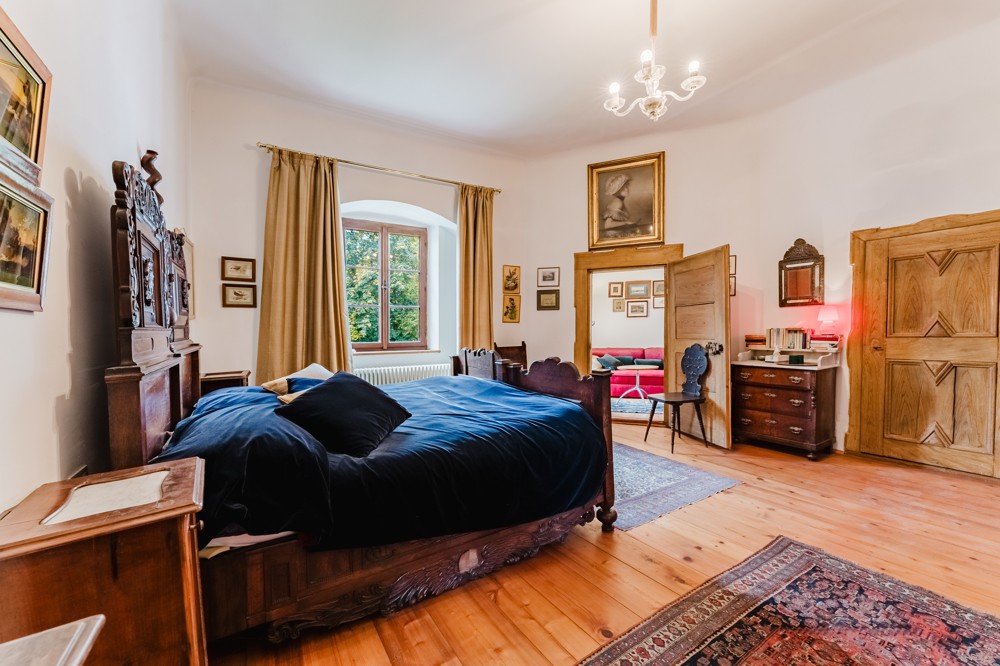 Inside, the residence reveals an ensemble of extraordinary beauty. Spacious rooms with lofty ceilings, ornate stucco work, and original wood paneling tell stories of centuries past. Stately fireplaces create cozy corners in an aristocratic atmosphere, while the charming chapel dedicated to St. Nepomuk—decorated with intricate Rococo altars and works by Baroque painter Bartolomeo Altomonte (1769)—adds a spiritual dimension to the property.
