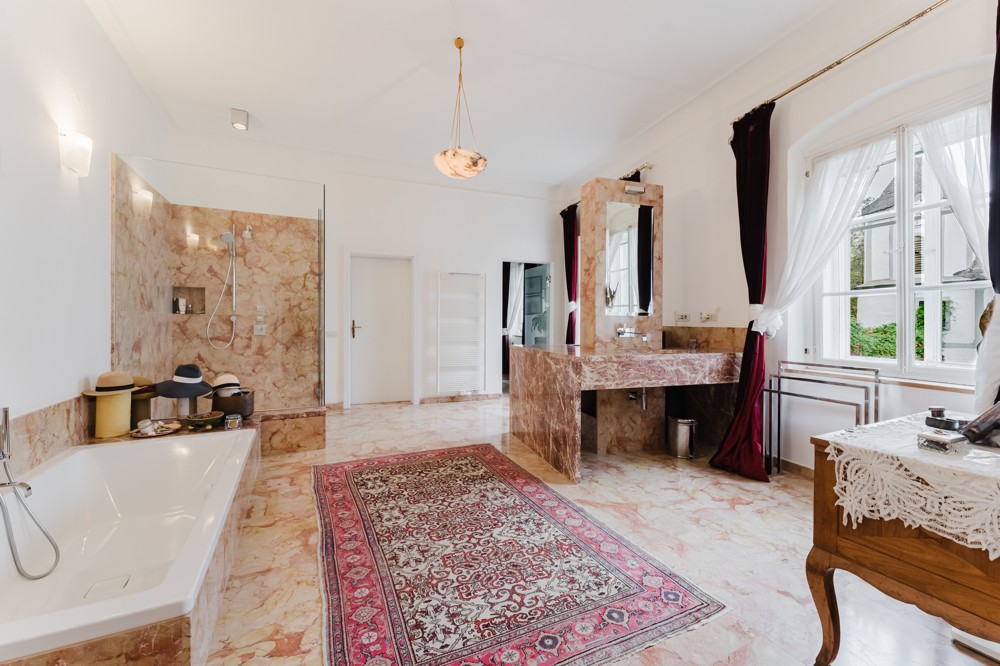 The expansive castle gardens are a haven of tranquility and beauty. Ancient trees whisper their stories, rose beds enchant the senses with their fragrance, and meticulously maintained park areas invite extended strolls. In a secluded corner, a generous pool area combines modern luxury with historic ambiance.