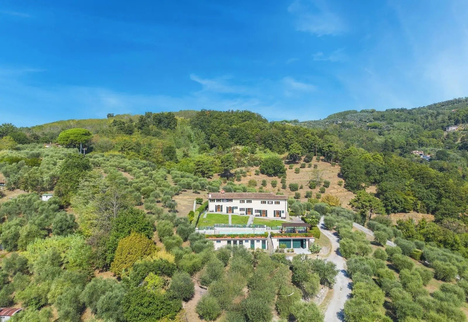 Villa Marsetti occupies an elevated position on the ridge above Montecatini Terme, surrounded by 10 hectares of private land comprising olive groves (over 500 trees), orchards, and established pine forest. The property combines residential infrastructure with agricultural terrain in a setting characteristic of the Tuscan hill landscape.