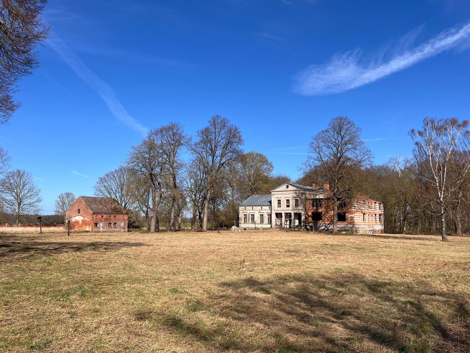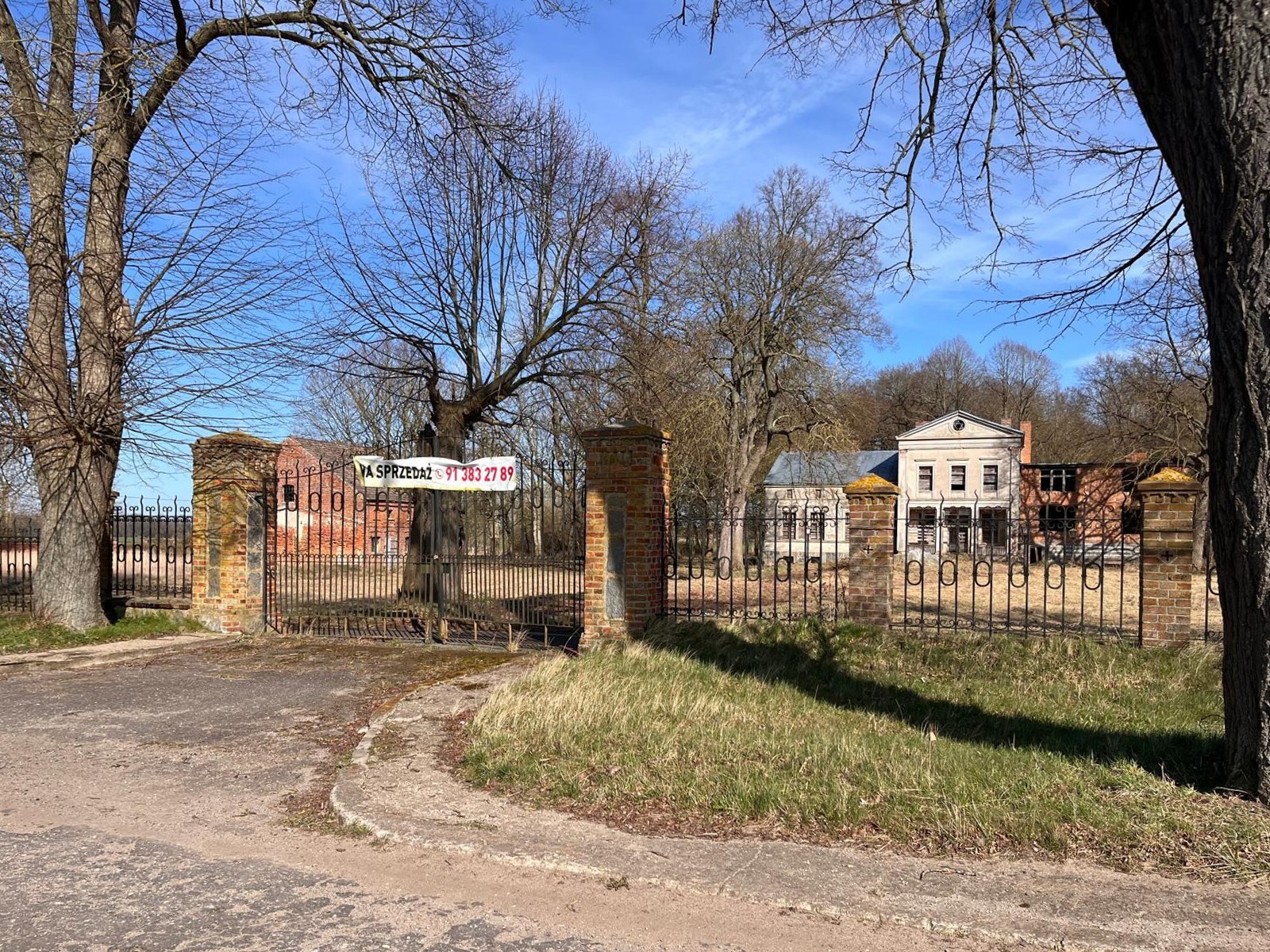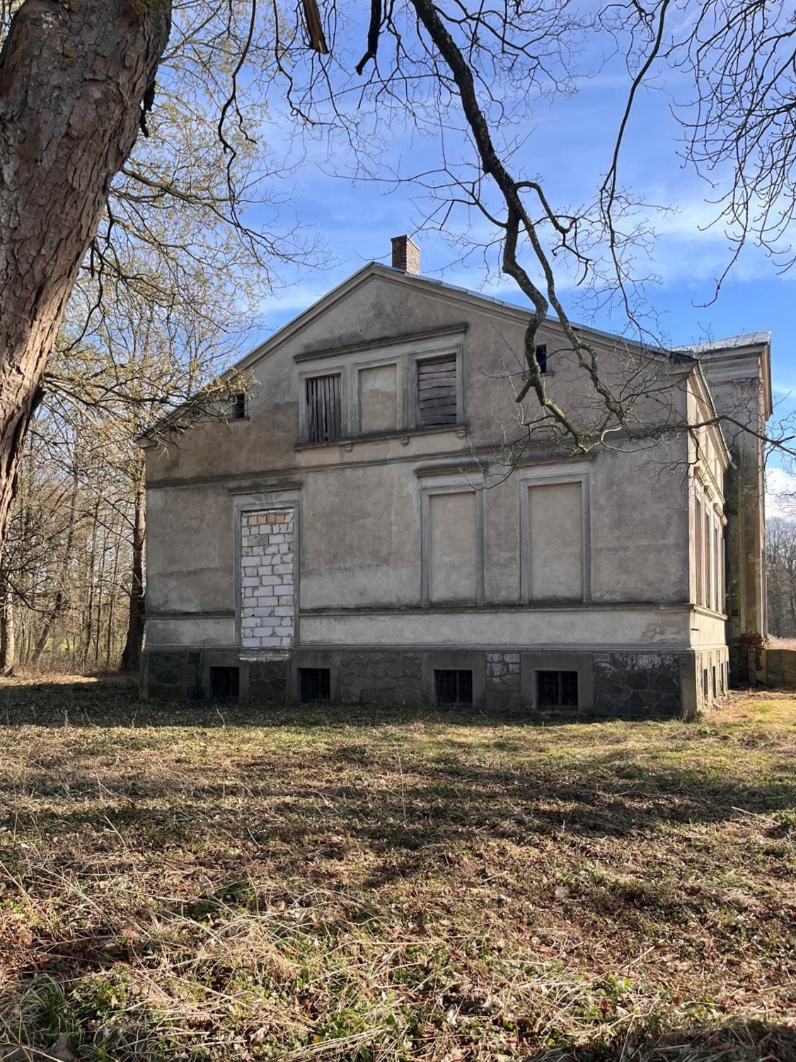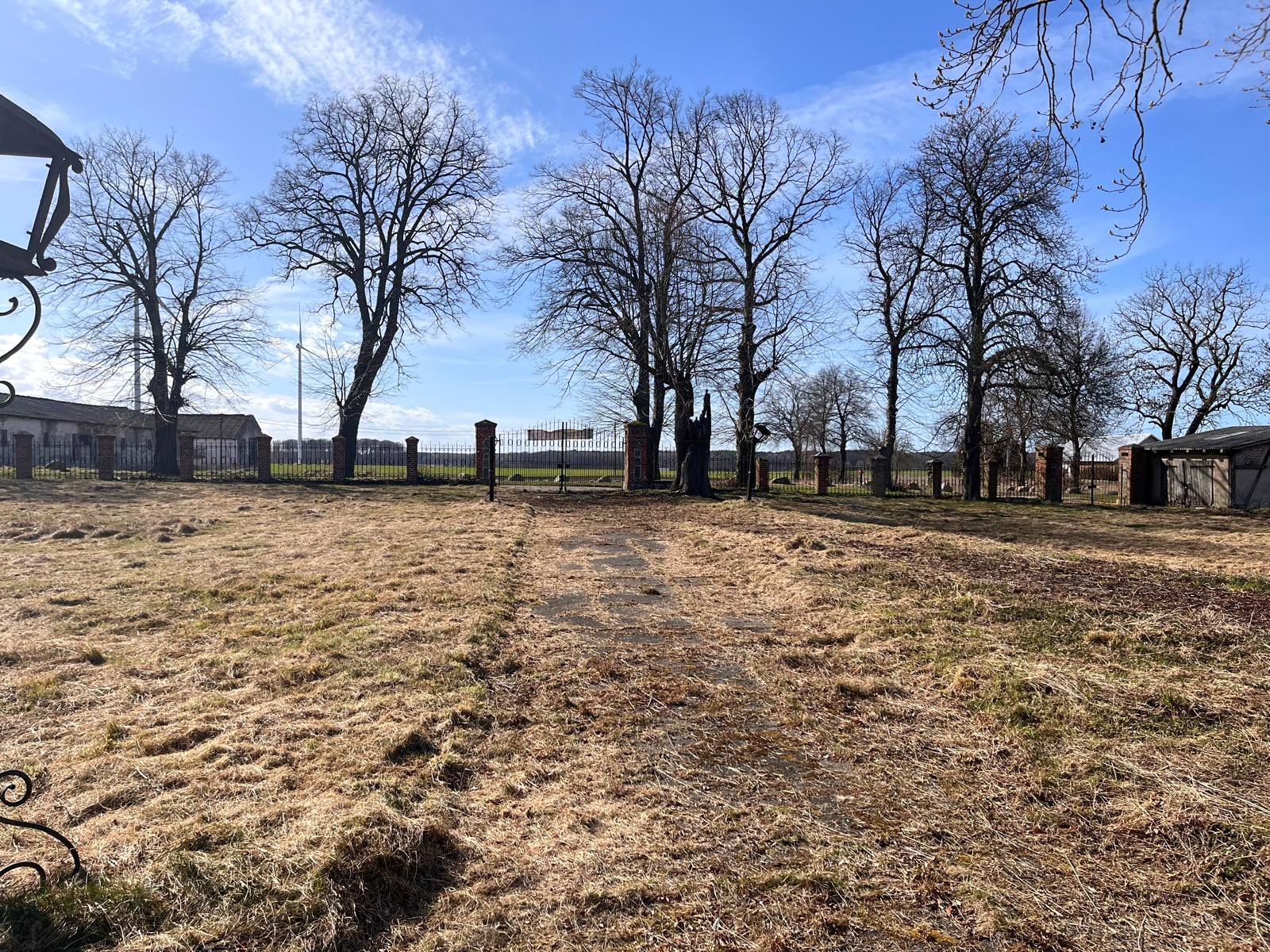 The property is located on the outskirts of the village within a former estate park with partially preserved mature trees, mainly beech, linden, and hornbeam. A pond and a former utility building are also present.