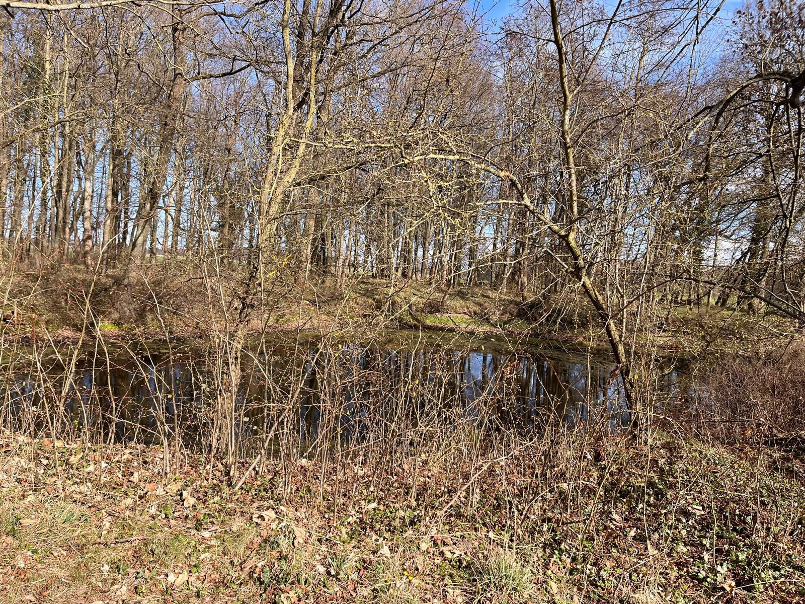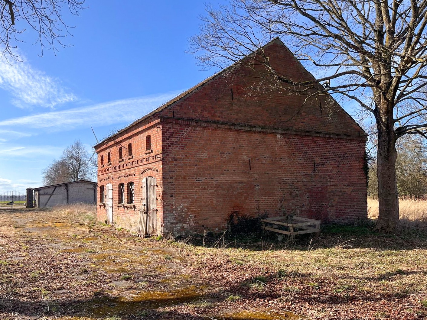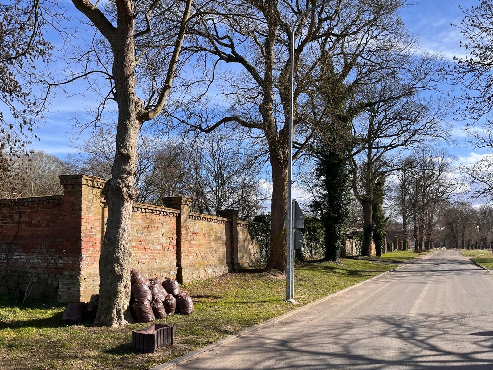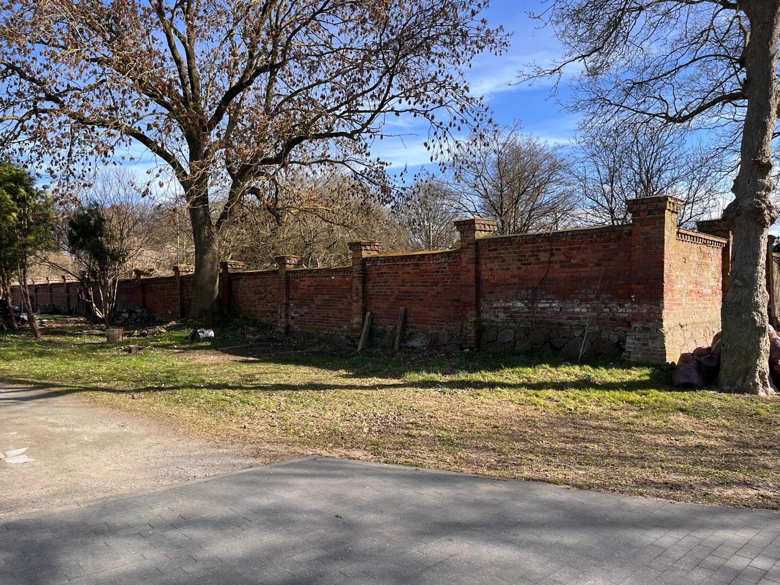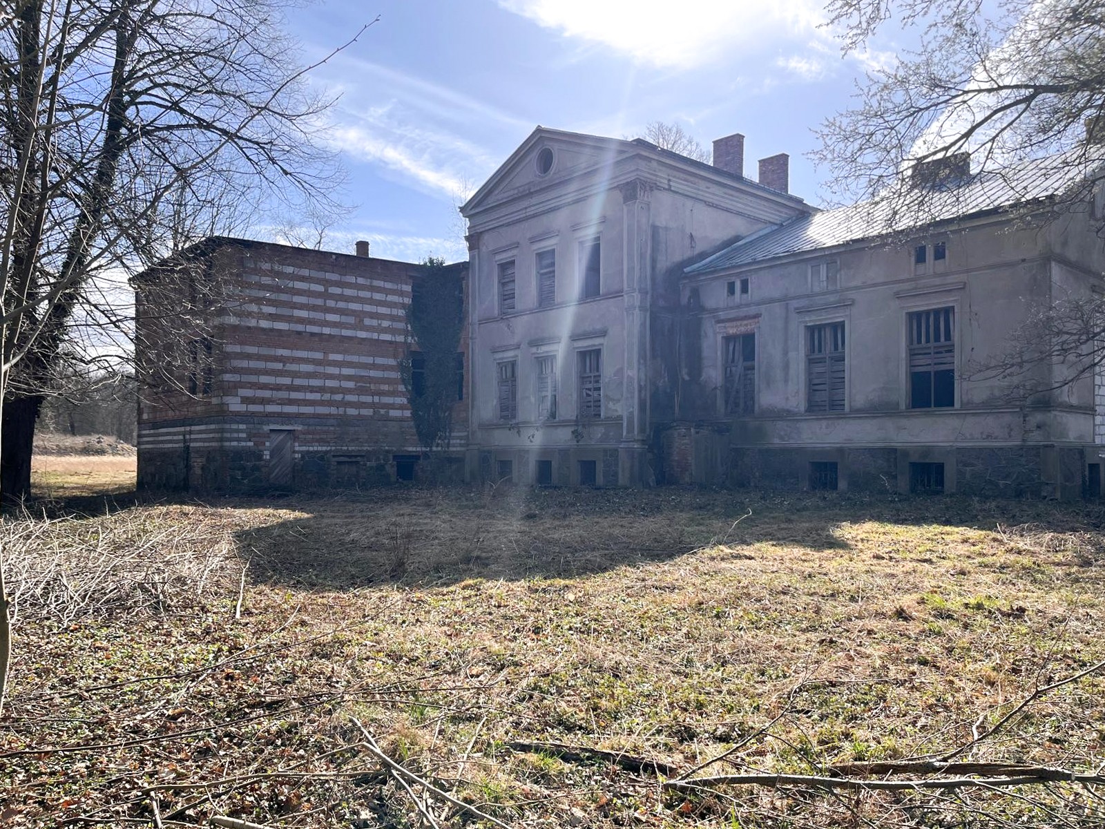 The property is located on the outskirts of the village within a former estate park with partially preserved mature trees, mainly beech, linden, and hornbeam. A pond and a former utility building are also present.
