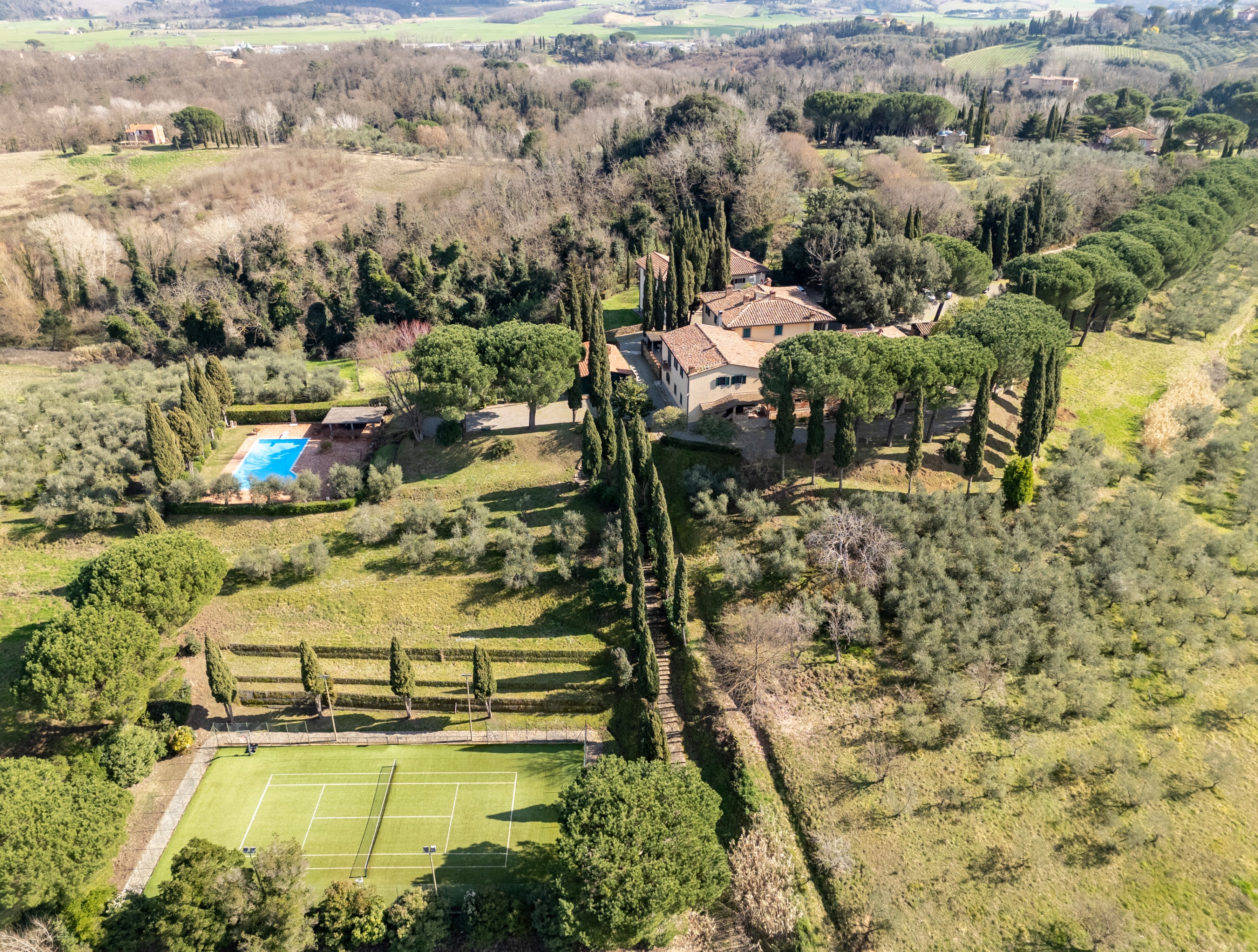 30 hektar i det böljande landskapet i provinsen Pisa. En historisk egendom med jordbruksproduktion och pågående hotellverksamhet.